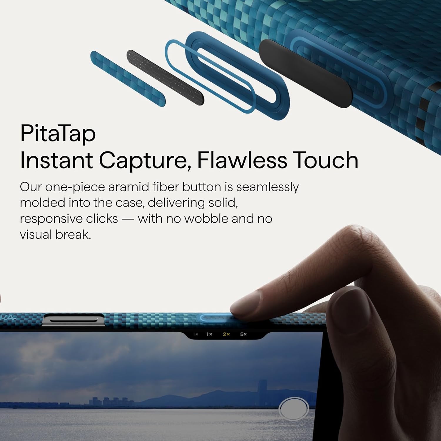 O carcasa cu o grosime sub 1 mm protejeaza butonul de control al camerei cu fibra de aramida, in timp ce un strat capacitiv ascuns va permite sa atingeti si sa glisati fara efort. Integrata perfect, pastreaza textura aramidei pentru un control precis si receptiv.